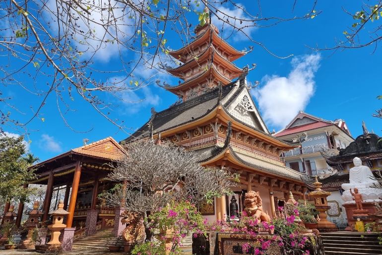 Có một điểm đến đặc biệt không thể bỏ qua khi đến với Biển Hồ chè, chính là ngôi chùa Bửu Minh nằm cuối con đường thông trăm tuổi, bao quanh là những nương chè. Đây là một trong những ngôi chùa Phật giáo đầu tiên được xây dựng ở Gia Lai.