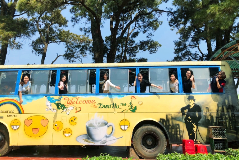 Gần đây mô hình xe cà phê mới khai trương, trang trí bắt mắt càng tạo thêm sức hút cho điểm du lịch này. Mọi người đến đây không chỉ để thưởng thức đồ uống, mà còn để “săn” những bức ảnh đẹp, lạ, đặc biệt là view ngắm cảnh đắt giá, giúp thu vào tầm mắt bức tranh thiên nhiên trong lành, xanh mát của đồng chè trăm tuổi. Chiếc xe ca được trang trí những hình vẽ và biểu tượng đầy màu sắc khiến nhiều bạn trẻ vô cùng thích thú. Nhìn từ xa, tiệm cà phê xe ca nằm dưới tán thông xanh ngay lập tức thu hút sự chú ý của du khách.