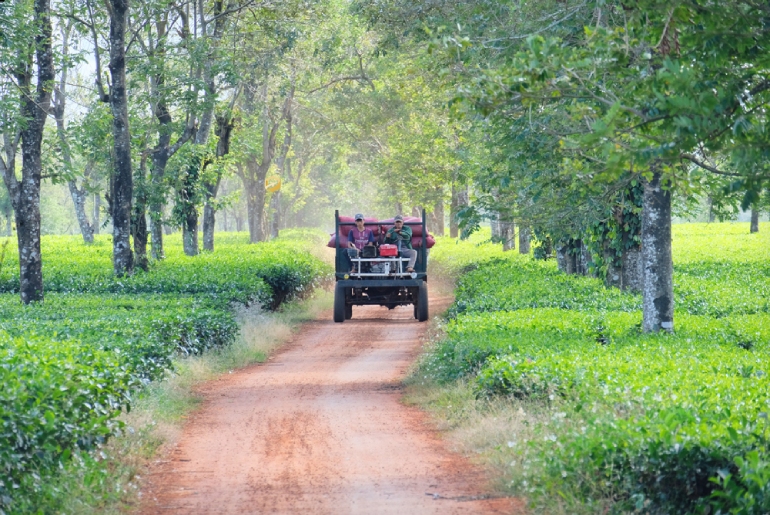 Làm nên vẻ đẹp tuyệt vời của đồi chè ấy chính là màu xanh bát ngát của nương chè trải dài khắp các sườn đồi. Một không gian mênh mông tràn ngập màu xanh của thiên nhiên như bừng lên sức sống mãnh liệt giữa nắng gió Tây Nguyên.