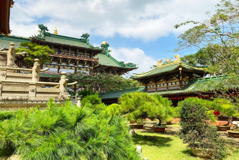 Khuôn viên chùa rất rộng, toàn thể là một mầu xanh của thiên nhiên cây cối, kết hợp với tượng đá, vật liệu gỗ chạm khắc tinh xảo, mang đến một khung cảnh thanh tịnh, uy nghiêm nhưng không kém phần gần gũi, bình yên.